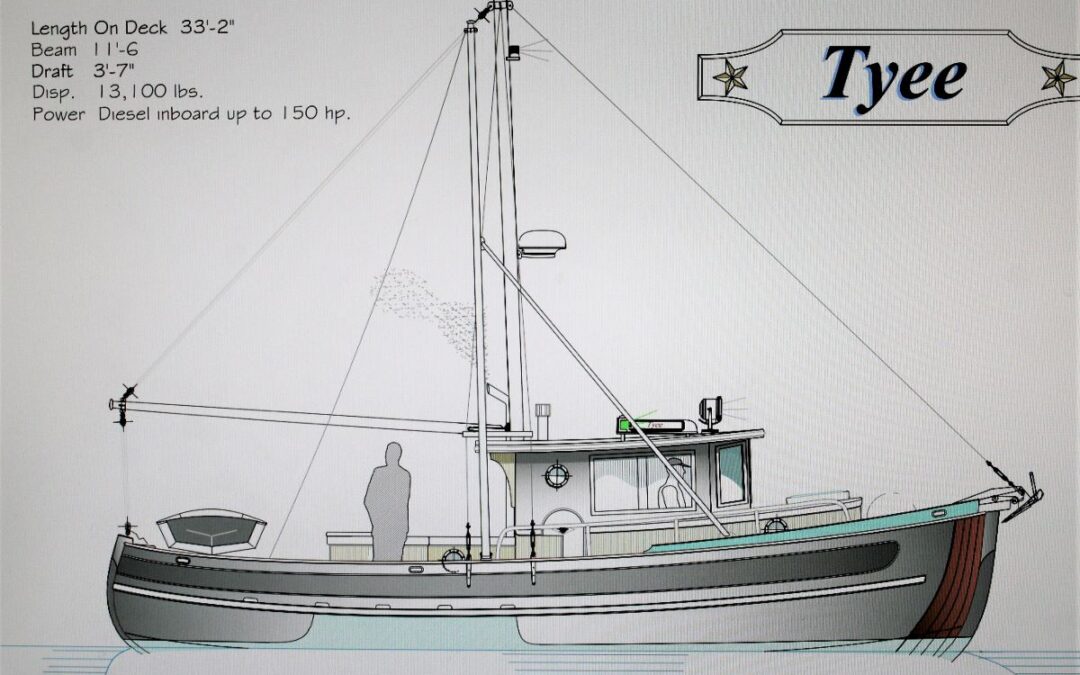 For many who have spent some harrowing hours in a small boat in rough seas there is only one type of hull that soothes the anxious mind – the double-ender. That’s a boat with two bows. Sam Devlin fell in love with the 1934 double-ended fishing troller Josephine while walking the docks at “Fisherman’s Terminal” in Seattle. He bought and restored her and she has taken him to Alaska and back on more that one occasion. In his latest design column for PassageMaker Magazine he awakens to the realization that this after all is his favorite type of boat. Hence, the Tyee 33 is born from the Rover design of a few years ago. This new design offers a very seaworthy cruiser for a couple with an occasional guest. Big enough to handle an angry sea yet small enough to single hand.