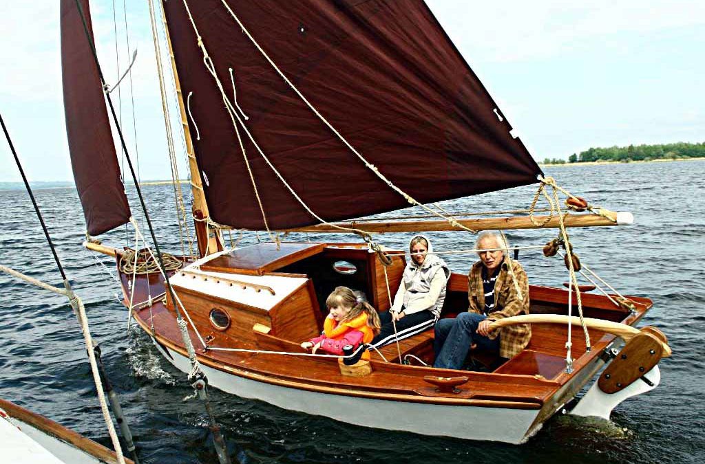 This boat is designed to be the ultimate in a pocket yacht with a tidy 176 sq. ft. sail plan. The Bermuda rigs mast steps on the cabin top and is easy to raise and lower. Winter Wren II has been designed from the ground up for trailering. Her hull has 685 lbs. of internal ballast and she sails stiff and stable. A very efficient dagger-board configuration is used for the lateral plane and Winter Wren II draws only 1’1″ of water when retracted and 3’6″ when extended. The dagger board trunk is in the cabin forming the edge of the galley. With the board raised, Winter Wren II is beachable and sits low on her trailer. With the dagger board down, Winter Wren II is a fast and responsive sailer. Her helm is very nearly neutral and the lightest of touch is required for instant response. She will easily sail through 90 degree tacks to windward, and off the wind, the Bermuda rig provides excellent performance.