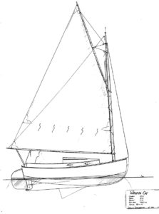 With an inboard small diesel engine of 10 hp. the draft of the boat is barely deeper than a centerboard boat and the small fin keep is hydrodynamically superior to the typical centerboard and large wetted surface of a more conventional catboat. With the fin keel the boat tacks well and points to windward like a racer and the Wompus Cat has all her 800 lbs. of ballast deep in the keel for stability and ability to hold up to windward work. Without having a centerboard trunk in the middle of the cabin the settees feel larger and certainly the leg room is more comfortable. A porta-potti or watercloset is set at the head of the settee and really is quite usable (a real trick in a boat of this size) and the two berths are commodious and comfortable for overnight cruising or just a quick nap on a quiet day, there is a filler cushion to convert the twin settee’s to one large double berth for those of you that have a cruising companion worth sleeping with. To the starboard side just forward of the rear bulkhead is a raised galley flat with room for a sink and stowage below for cooking utensils and galley stores. On the portside we put one of the excellent “Sardine” wood/stoves that Marine Stoves is building from cast iron. With a few small pieces of wood thrown in on top of a handful of fragrant cedar shavings, a match applied to the bottom of the stack and in a few minutes the cabin is warm, your coffee or tea is brewing and life feels good.