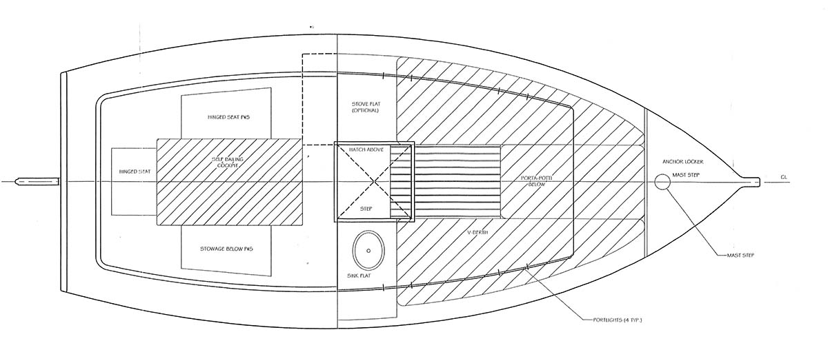 “Wompus Cat” is trailerable so that you can bring her home at the end of the season and go through your annual maintenance at your leisure in a covered work area. She is trailerable enough to allow some exploring of local waters that might be more accessible from the trailer than by water alone. Her draft allows the additional exploration of shallow waters and with the optional inboard diesel engine she can travel longer distances on those days that don’t have much wind. Entering the cabin you will immediately notice that there is no centerboard trunk in the way of the living space in the cabin.