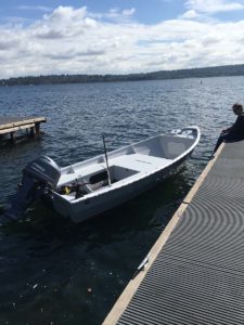 We ran into another Candlefish 16 on Lake Washington. It was a kids sailing school on the east side and it was used as the, committee, safety boat. The young guy waved us over and excitedly asked, “Is that a Devlin Candlefish?” He said he loved theirs as well, but that was envious of our 60 HP engine. Theirs had a center steering station. I’m glad I have just the tiller, as I’m really enjoying the spaciousness and openness of the boat. It makes it very flexible as far as where to put things and where people like to hang out.