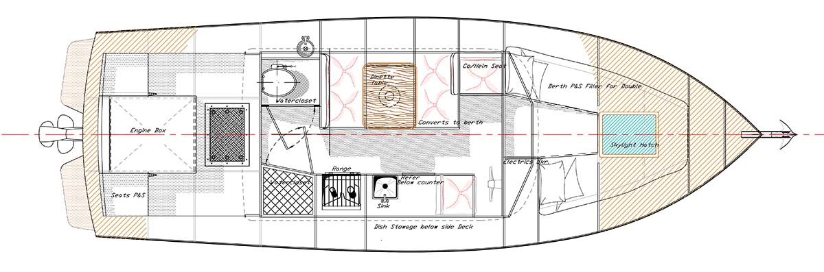 This new 30ft. version offers a commodious and comfortable cockpit with space for the engine box (we recommend a diesel Sterndrive in 160-250hp range) and seating for crew when the hook is down and you just want to enjoy the evening breeze. Going into the cabin there is a full enclosed and private head to starboard and a full headroom shower just opposite on the port side. Forward of the shower is a fore and aft facing dinette with room to seat 4 for cocktails or an intimate dinner. Galley is to starboard and forward of the head and aft of the helm seat. Space for a below counter refrigerator/freezer unit, sink, and range oven cook top. Helm seat is to starboard and forward of the galley as mentioned above and has excellent visibility and comfortable seating, room for electronics instruments etc.