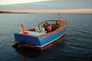 Starting at the stern is a teak swim platform to help board the boat from a harbor taxi and just forward of the transom is a large daybed with foam fabric covered cushions for crews that like to sunbathe to have a place to enjoy the day. Forward of the daybed, which covers the engine box, is a bench seat settee that is the full width of the cockpit and at the center of that seat is a console type helm area. The Captain can either sit at the bench and steer or can stand and operate the boat. Engine controls are electronic and there is an interesting false top to the console that can be hinged back to expose other fancy electronics, GPS, VHF, Depth, and Speed instruments. The engine gauges are easy to read and accessible for controlling the boat. The steering wheel itself is a custom Italian thing that would not look out of place on a mid-sixties classic Ferrari. Forward of the center console are port and starboard upholstered seats that allow guests good side to side visibility out of the boat. There is a small windscreen with a convertible rigid top section and canvas top section that allows two people to sit out in the sun when folded forward and four people to sit under cover when folded aft and the weather is not cooperating. Under the forward deck area are two bunks long enough for a couple of tall people to comfortably stretch out on and up in the bow, a marine water closet can be fitted giving the whole forward cabin the capability of providing a degree of seclusion for head type activities. On deck, the bow has a hatch over the main part of the sleeping/head cabin and an electric anchor windlass powers up a polished stainless steel anchor on a bow roller. All cleats are of the stainless steel pop-up variety and deck trim is also polished stainless steel. The decks themselves are laid teak finished raw and when scrubbed a couple of times a year with bleach and water, they are the best non-skid material that exists and they lend a look of fine craftsmanship to the boat. There is a low bow pulpit to help keep your crew on deck and a low aft railing around the cockpit. The neatest feature of the exterior is the gracefully curved, varnished mast with some signal flags displayed and with a proper large ensign on the stern, the “Blue Blazer” looks dressed up for the occasion and ready to transport her crew around for the day.