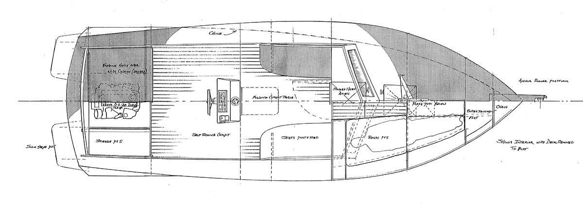 With my own weather being raw, wet, and cold at times, it’s difficult to be empathetic with the concept of the fair-weather use of such a boat but I was committed to doing my best interpretation. So armed with Jack’s list of parameters of boat use and gear, I retreated to the back of the design office where most of the serious boat drawing takes place. The hull wasn’t that hard to work up a concept for since we already knew roughly how big she needed to be but I kept getting gummed up on Jack’s requirement that there be under cover sitting spots for at least two people. Every time I tried to sketch in a covered roof area, the whole thing started to look like a small pilothouse. Now most of you that have looked at my designs know that I tend to be a pilothouse aficionado for both large and small boats because to my eye, they look well-proportioned and purposeful. So it would be safe to say that among the early preliminaries of this design, there were several boats that looked somewhat like stretched out low profile Surf Scoters with an amidships pilothouse and big cockpit.