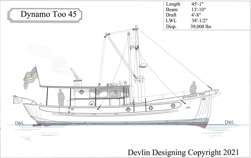 Dynamo Too 45 study plans include 4 pages showing both a motorsailer and powerboat version of this ocean going cruiser, inspired by the designs of the late Bill Garden.