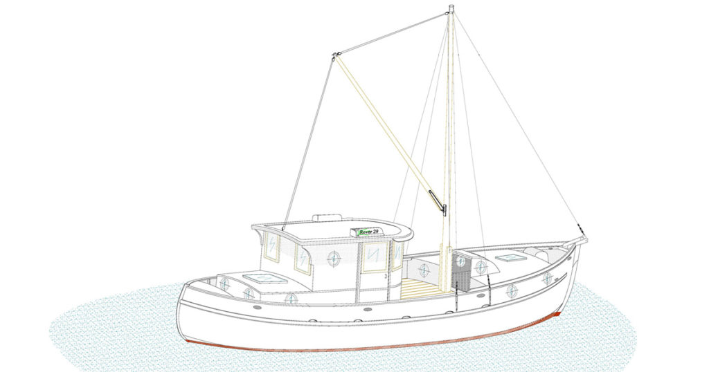 The Rover 29 is a diesel powered, double ended, full displacement sturdy and seaworthy cruiser inspired by the little fishing trollers of Norway. The troller design is for the fisherman and minimalist boater