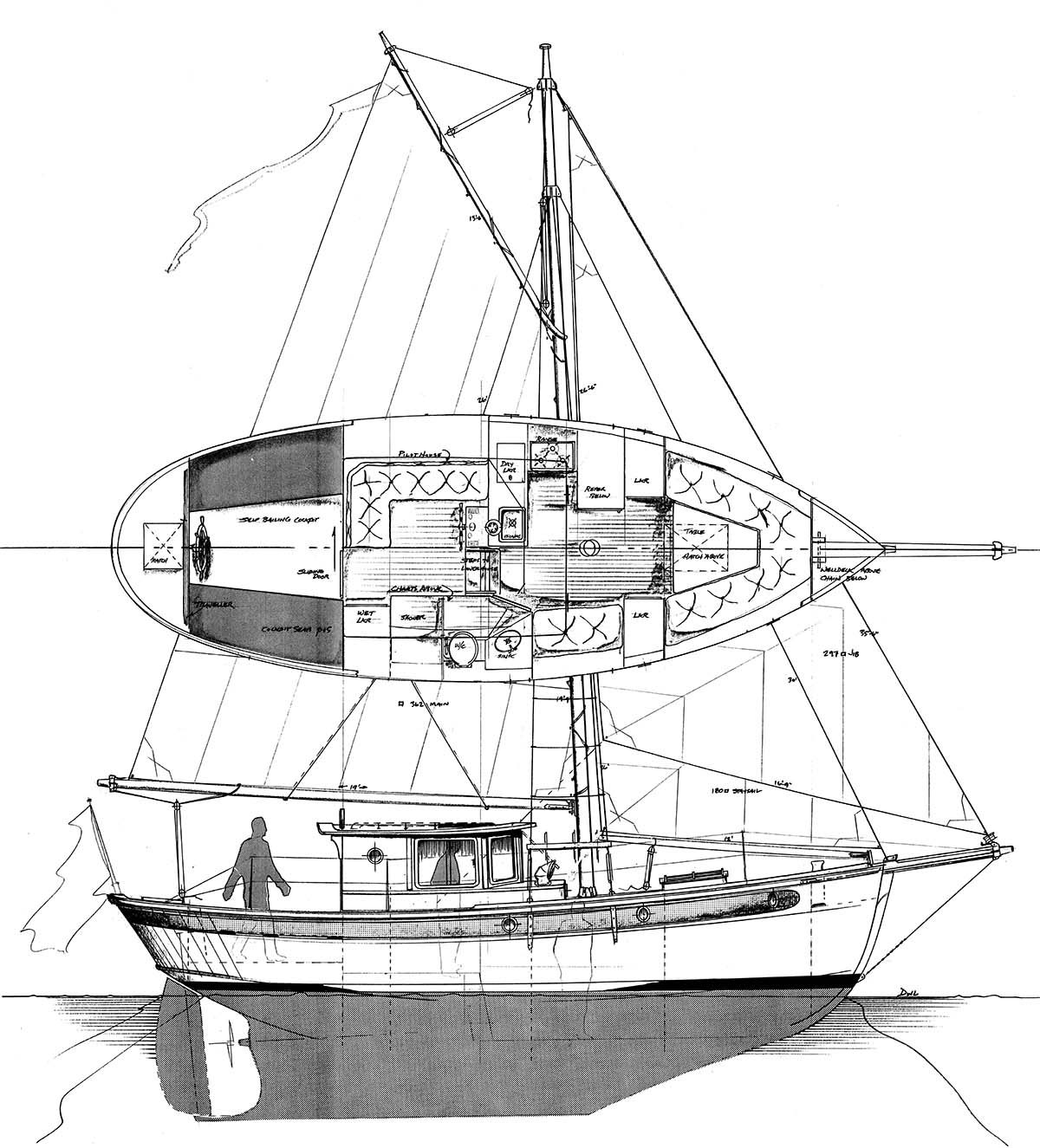 Somewhere in 2005 I was contacted by a customer about the idea of designing a motorsailor suitable for some extended passagemaking. She had to be stable and a decent boat both under power and sail. Unfortunately, he was caught in Hurricane Katrina and his boating plans changed abruptly, but I thought you might like to take a look at what I came up with to address his needs. I don’t need to remind anyone that most trips in a sailboat that are longer in duration than a brief afternoon wandering about on the water involve some sort of an engine, and that engine most likely spends more time in action than the sails on the boat. Thus it has puzzled me for many years why don’t we see more boats on the water that resemble this Camarone 34 with her pilothouse, enclosed steering, decent and low center of effort sailplan appropriately split up into small enough panels to actually get used, not just sleep under sail covers. When using her for cruising, the inboard steering allows warm, quiet, and comfortable cruising under power and if you are so lucky to have favorable breezes in the afternoon, you can transition to the cockpit and run her very nicely either sailing or motorsailing.