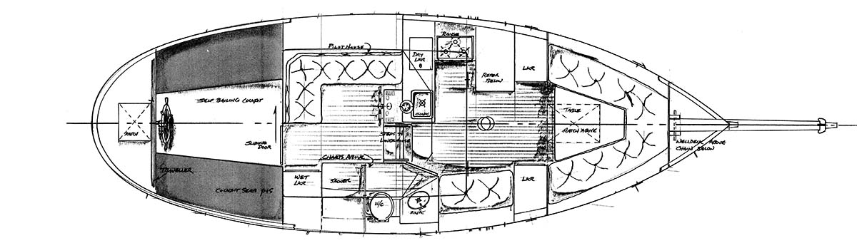 For our Northwest cruising with our capability of boating well into the Winter season, I would opt for a diesel range with oven built-in and a full hot burner top, allowing us to always keep a coffee or teapot ready to use. Up forward in the bows of the boat is a very interesting arrangement with a port and starboard berth seating area and table in the middle. With the table folded down, the area turns into a swell full double berth with enough swinging room to keep any cruising couple in good shape. When in passage, you could leave the table in the up position and have a nice separate port and starboard berth. One really cool idea with this design is that once you are down below, you are looking clear up into the bows of the boat. When so many other boats keep the main cabin cut up with separate cabins, this one feels bright, airy, and large. The flush deck also adds to the look and feel of this forward cabin with 4” x 4” beams being the only thing breaking up a tongue and groove, yellow cedar fore and aft planking. This gives a warm and textured feeling to the spacious cabin. We put plenty of draft and plenty of keel under her to allow good sailing and a very balanced helm with any of the sail/power combinations that might be possible with her.