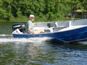 Let’s start on this inspection of the boat with a profile (sideways for you landlubbers) look at her – a strong sheered multi-chined hull that looks just about right to my eye. She is plenty deep, in fact, perhaps just a little bit too deep but that will pay dividends the first time I linger a bit too long beachcombing when the afternoon trades kick in. That’s the time when I will be happy to have the extra freeboard and it should help greatly to get me off the beach and to keep me dry and safe in all sorts of sea-conditions. Looking from the plan view (that is the overhead, or top view) at the boat, adjacent to the stern there are two longitudinal seats on each side of the rear of the boat. I always intended to tiller steer the Candlefish and so with those seats, I can steer left handed or right depending on my daily preference. There is plenty of leg room in front of the seats for those stiff arthritic knees of mine and forward of the seats is an interesting mid-deck area, a sort of cargo hold. This is lockable and holds a lot of gear, including a battery box if the electric start outboard I was drooling over was sprung for. The mid-deck keeps passengers forward and out of my way and is a handy height for re-baiting crab or shrimp traps or to remove our catch if successful. Passengers can sit on the forward edge of the mid-deck and if they have bad backs, I can reach into the cargo hatch and pull out simple, but very efficient, folding padded seats for them to lean back on. They will have their own leg space forward and a small forward deck (bulwarked by the hull sides and bulkhead #1) to allow the anchor to be chocked down on top of and with the rode stowed in the stowage and flotation space below. This forward work deck really functions well with my dog occasionally perched on the bowdeck in figurehead position, ears all a-flappin in the wind.
