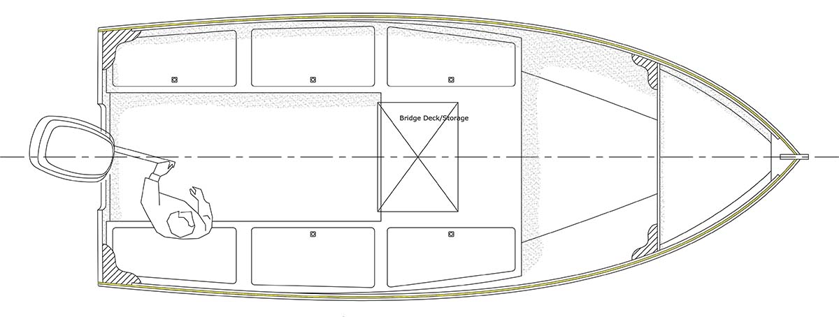 The Candlefish 18 is largest boat in the Candlefish lineup. Her hallmark is simplicity and utility, with a dash of performance from the incorporation of the Pelicano 18 hull. This a hull that works very well as the foundation of a number of Devlin designs. In this application it combines the flexibility of an open boat with the seaworthiness of a relatively tall hull. Sam has worked in large and flexible seating over the top of a huge amount of dry storage with even more storage in the bow. There is plenty of room for reserve buoyancy that, even in an unsinkable design, adds the peace of mind that comes from knowing the boat will float, level and stable, even when full of water. If the smaller Candlefish boats are waterborne pickup trucks, the Candlefish 18 is the moving van.