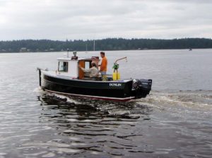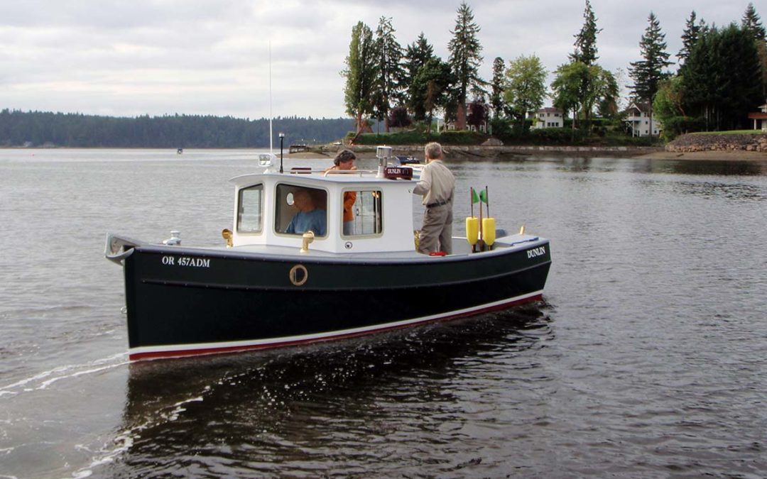 It was many months later that we launched her to the joy of the crew and her owner and on early sea-trials, the 60hp Yamaha 4-stroke outboard showed a top speed of 16mph and a good and easy cruising speed of 12mph. She floated exactly on her lines and is now beloved by her owner in her home on Coos Bay.
