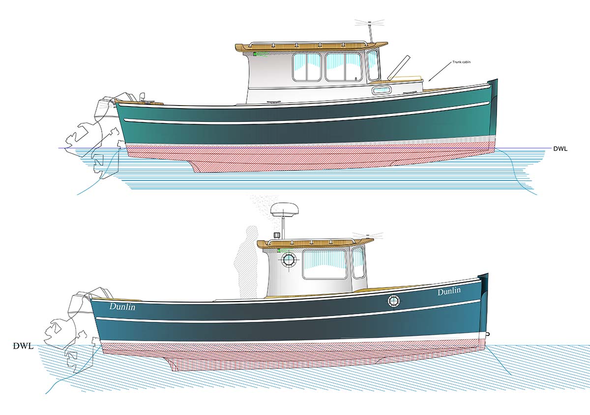 The Devlin Dunlin 22 began as a larger version of the pocket workhorse Godzilli 16. After Sam was finished, he expanded the boat into two configurations, both of which can provide you with all the work and play you could want in a boat this size. With a 60hp high thrust outboard and a very strong structure, the Dunlin 22 can be used for a wide range of pursuits. With a cabin designed for plenty of headroom, a heating stove, a double berth, stowaway space for a porta-potty, and a galley counter, it can also serve as a comfortable place to relax after the work is done. For the details and thought that went into this versatile workhorse, see below.