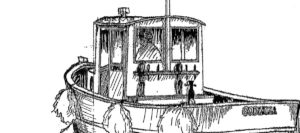 There are tow bits forward and aft, substantial things of heavy wood construction with grown knees for reinforcement at the decks, a mast with the required 3 white towing lights shown and that about sums it up except for the excellent fenders that Barbara Merry made for us. A bow puddin forward for pushing and six fenders at the sides for coming up against a barge, dock, or boat. The fenders are aircraft tires with a puddin of baggywrinkle for chafe resistance. All and all, she looks very workmanlike as she sits at the dock waiting to start her day’s worth of work. John just sent me a sketch of a twenty foot barge that his small John Deere tractor can fit on and with a small deposit check, it looks to be the next project. As for me, I am content with thinking about building my own “Godzilla” and can just imagine idling away a warm summer day. Taking a break from the grind by letting her just drift on the tide with the engine shut down listening to the small noises it makes as it cools down. A cup of good strong tea and if it’s a special day, perhaps a good cigar saved for just this type of moment. Ahh….life can’t get any better than this, unless I add a bit of rum to the tea! — Sam Devlin