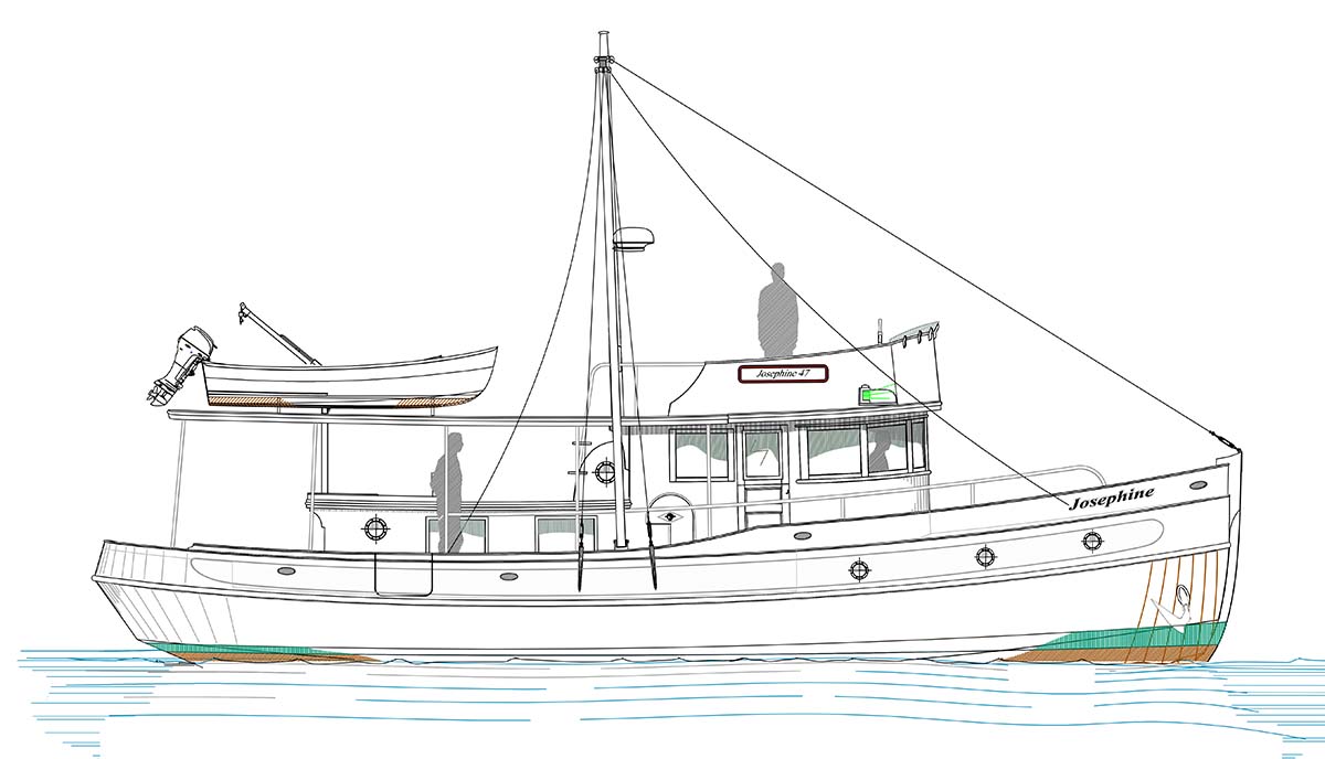 Born of a man's love affair with an antique boat, the Josephine 40 is a modern adaptation in many configurations. All the charm with the ease, convenience, and low upkeep of a modern boat.
