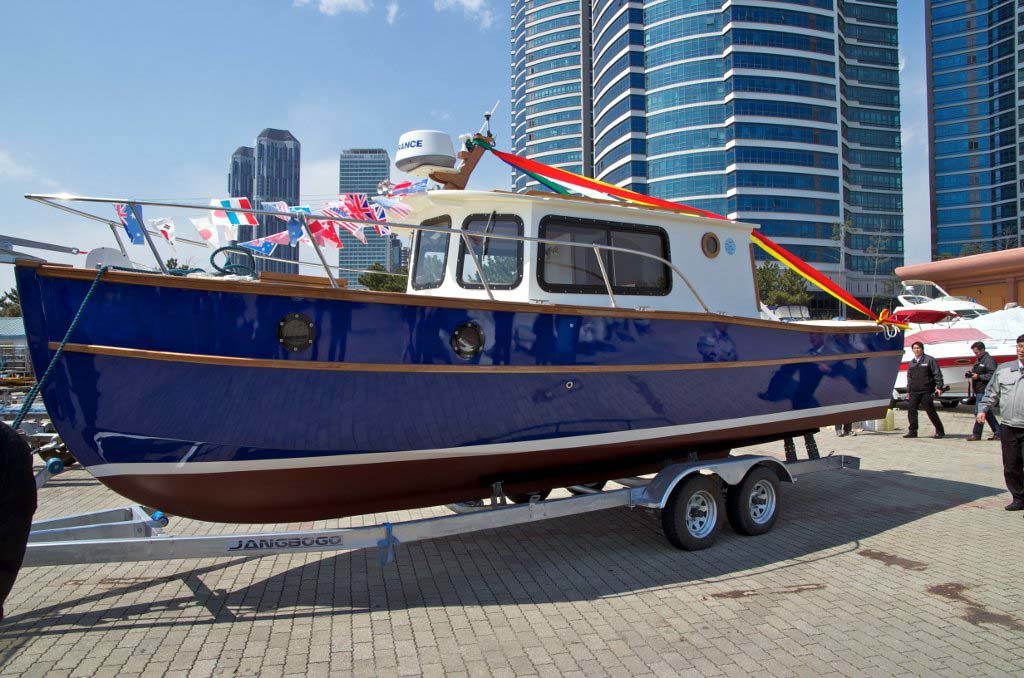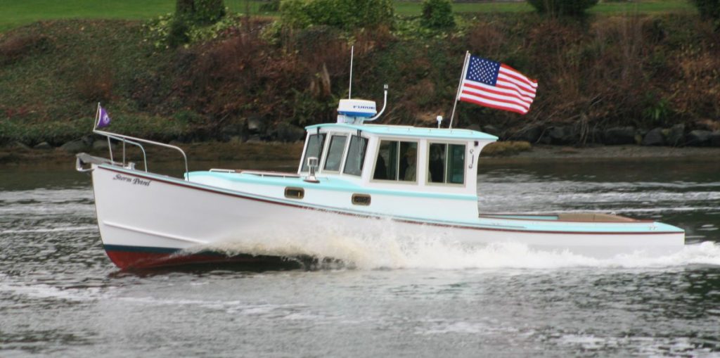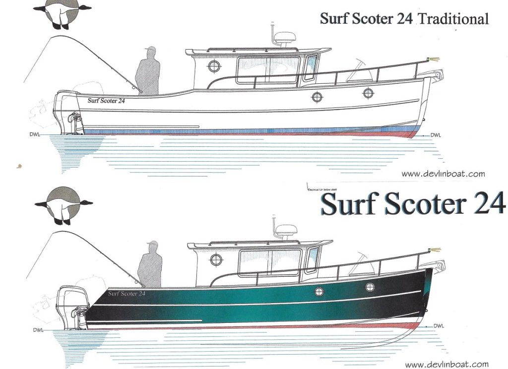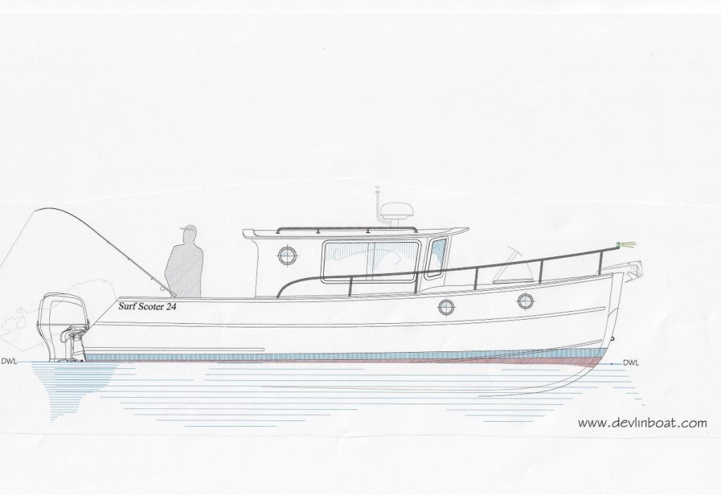 The venerable Devlin Surf Scoter 22, revised for pilothouse configuration and outboard power.